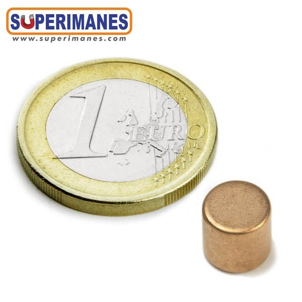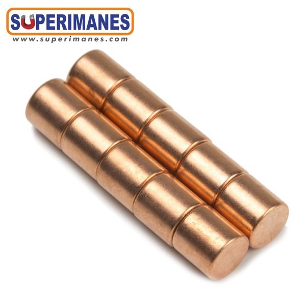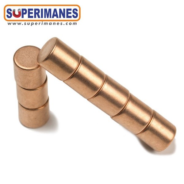 ¡Es de cobre! Es como nuestro imán D-08-08 pero sin su capa final de níquel, sino que su última capa es en cobre. Imán fuerte pero pequeño, tiene bastante fuerza como para sujetar varias hojas, fotos, notas. Por su color cobreado es usado para lugares donde quieres dar un tono de color diferente.