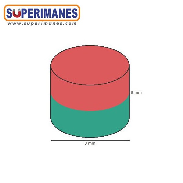 Este pequeño imán de neodimio en forma de disco redondo tiene un diámetro de 8 mm y altura 8 mm. Disco magnético con fuerza de sujeción de 2,5 kg aproximadamente. Magnetizado en N45 axial. Con revestimiento de su capa final en cobre. Temperatura máxima de servicio de 80º C. La pieza tiene un peso de 3,1 gramos.