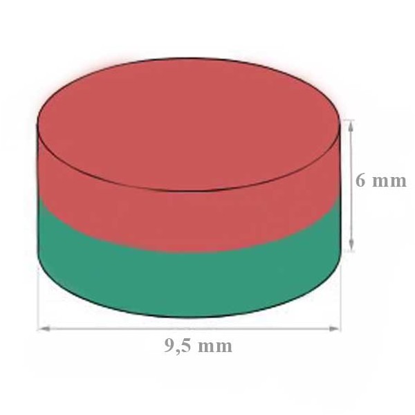 Este imán de neodimio en forma de disco redondo tiene un diámetro de 9.5 mm y altura 6 mm. Disco magnético con fuerza de sujeción de 3 kg. aproximadamente. Magnetizado en N38 axial. Con revestimiento de níquel. Temperatura máxima de servicio de 80º C. La pieza tiene un peso de 3 gramos.