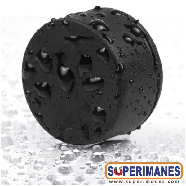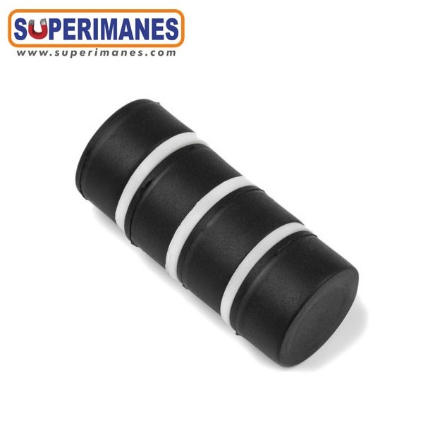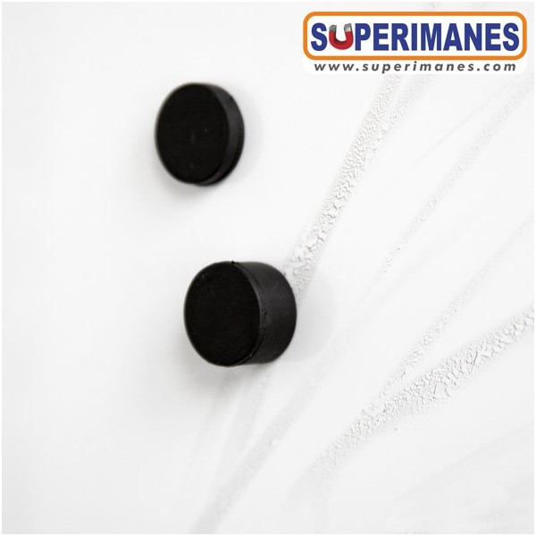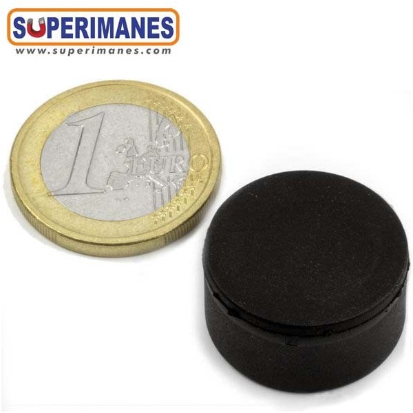 Imanes de neodimio impermeables con revestimiento de goma, permanentes y fuertes. Disco magnético en neodimio con diámetro de 22 mm y altura de 11,4 mm. Tienen fuerza de sujeción de 7,1 kg. aprox. Imán magnetizado en N42 axial. Con revestimiento de goma para usar en exterior. Temperatura máxima de servicio de 80º C. La pieza tiene un peso de 24 g.