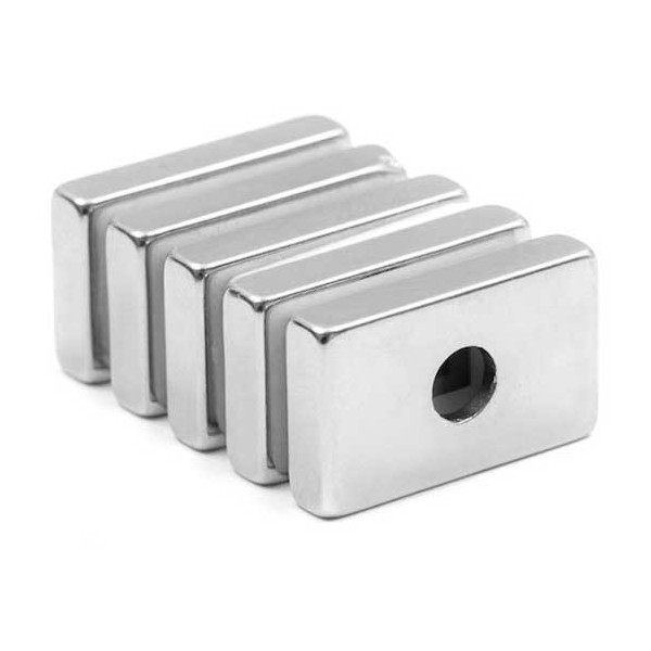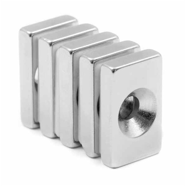 Este imán de neodimio en forma rectangular está realizado con 1 taladro para poderlo atornillar. Tiene una medida de 20x12 mm y una altura de 4 mm. Lleva 1 taladro avellanados para usar con tornillos de cabeza avellanada. Bloque magnético con fuerza de sujeción de 5,2 kg. aproximadamente. Magnetizado en N35 axial. Con revestimiento de níquel. Temperatura máxima de servicio de 80º C. La pieza tiene un peso de 6 gramos.