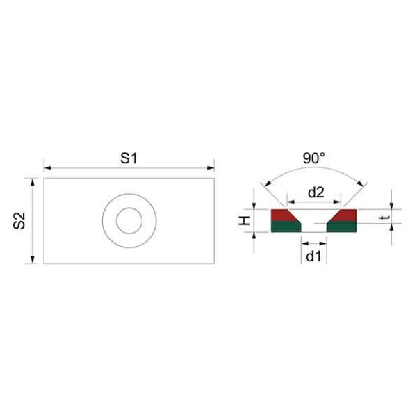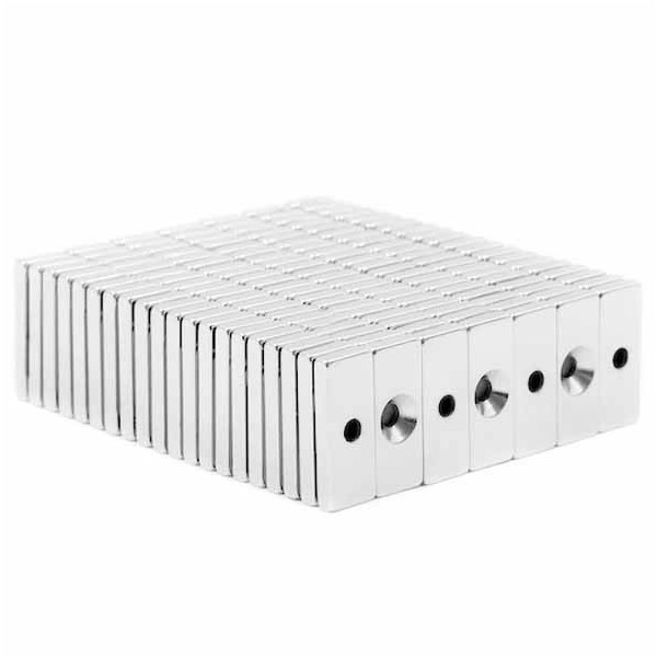 Este imán de neodimio en forma rectangular está realizado con 2 taladros para poderlo atornillar. Tiene una medida de 28x12 mm y una altura de 4mm. Lleva 2 taladros avellanados para usar con tornillos de cabeza avellanada. Bloque magnético con fuerza de sujeción de 4,5 kg. aproximadamente. Magnetizado en N35 axial. Con revestimiento de níquel. Temperatura máxima de servicio de 80º C. La pieza tiene un peso de 9 gramos.