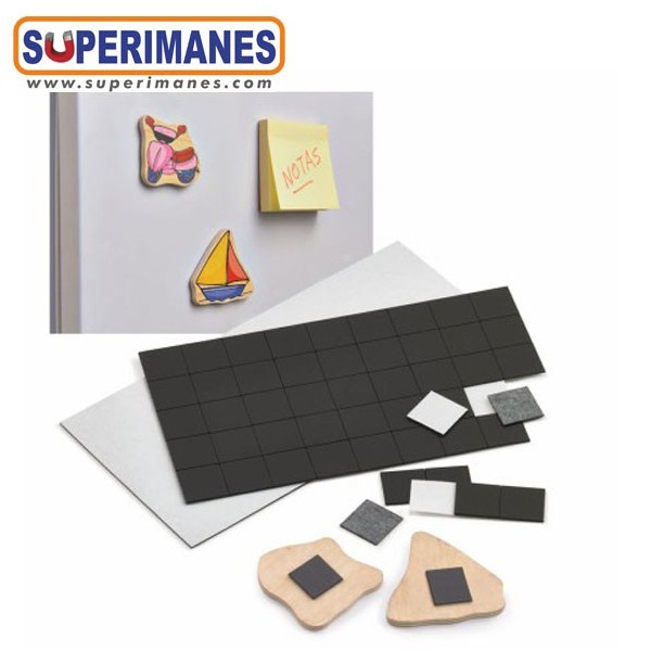 Láminas magnéticas precortadas en cuadraditos de tamaño 2x2 cm adhesivos. Cada hoja trae 50 cuadrados magnéticos troquelados. Cada hoja tiene un tamaño final de 20x10 cm de 1mm de espesor. Tienen magnetización anisotrópica. Estos imanes flexibles precortados son muy útiles para pegarlos en fotos, tarjetas, notas, postales, dibujos.