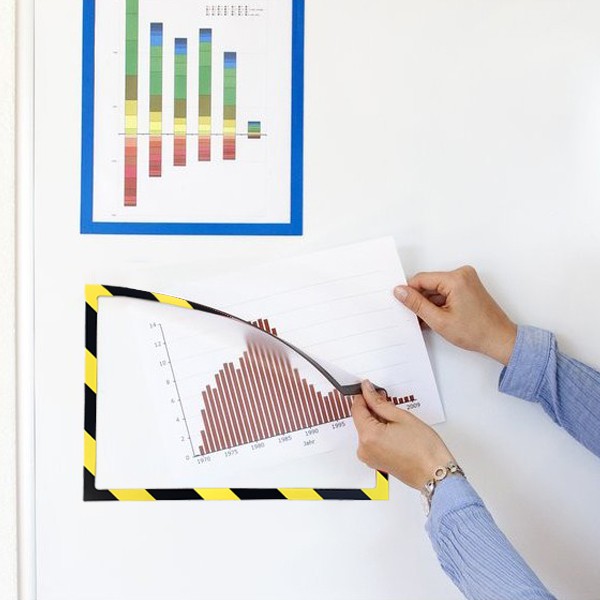 Estas hojas magnéticas tienen el tamaño idóneo para poder insertar en ellas hojas tamaño A3. Fabricadas en el centro con láminas de PVC transparente brillo flexible ligeramente rígido y su alrededor tiene un marco magnético de diseño a rayas en amarillo/negro para poder usar en pizarras o paredes metálicas para señalizar notas de precaución. Magnetización isotrópica. Grosor total del marco 2 mm. El producto tiene un peso de 90 gramos aproximadamente. Su tamaño es un poco mayor que un formato A3, tamaño 447x330 mm. Lleva el vinilo en colores con las esquinas exteriores rectas e interior esquinas curvas.