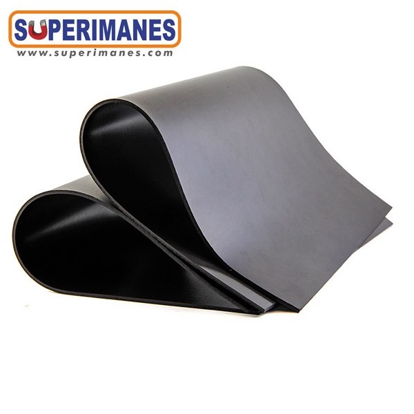 Los imanes flexibles en planchas tienen un ancho de 42 cm y un largo de 1.2 metro. También disponible en largo de 60 cms. Esta placa magnética tiene un grosor de 5 mm. Estos imanes tienen magnetización a una cara. Su material es plastoferrita y son de color negro-gris. Magnetización anisotrópica. Sin revestimiento. Temperatura de servicio entre -20 ºC a 85 ºC. La pieza tiene un peso de 9217 gramos.