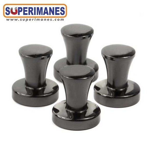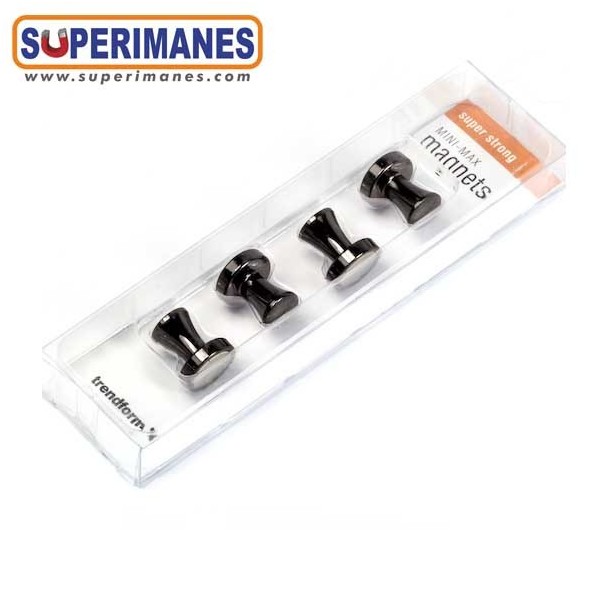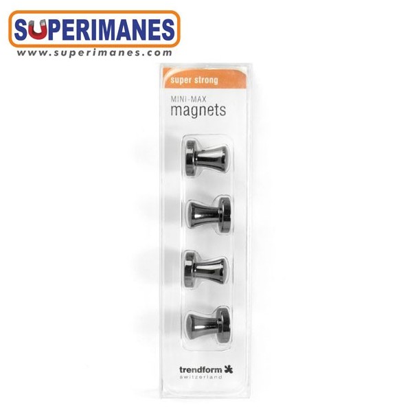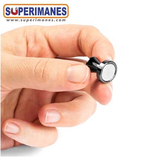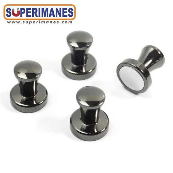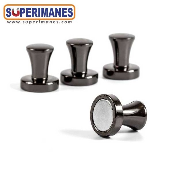 Imanes con mango metálicos color antracita, con imán de neodimio en el interior. Pequeños y muy fuertes. Ideal para colocar notas, fotos y otros documentos en pizarras, frigoríficos, tableros o paredes metálicas. Imán con fuerza de 3,9 kilogramos aproximadamente, magnetización axial. Pueden llegar a sostener 10 hojas A4. Set de 4 pinzas/paquete.