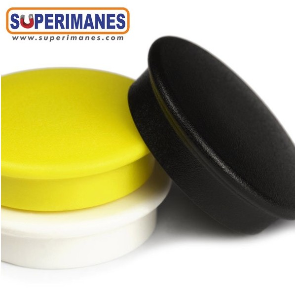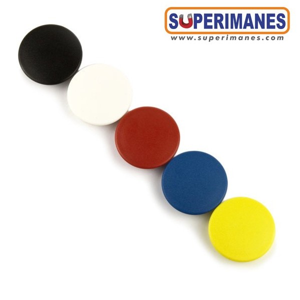 Imanes redondos para pizarras magnéticas, con imán de neodimio en su interior y carcasa de plástico en colores. Ideal para aguantar notas, fotos y otros documentos en pizarras, frigoríficos, tableros o paredes metálicas. ¡De 30 mm de diámetro!. Fuerza de 1,5 kg. aproximadamente. Magnetización axial. Gran surtido de colores. Carcasa de plástico ABS resistente a la luz. Set de 25 imanes por paquete.