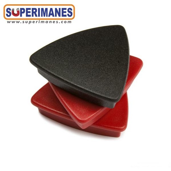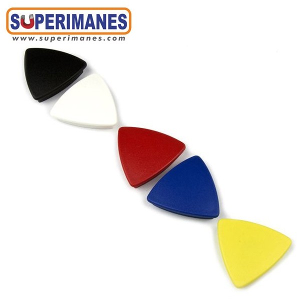 Imanes en forma de triángulos para pizarras magnéticas, con imán de neodimio en su interior y carcasa de plástico en colores. Ideal para aguantar notas, fotos y otros documentos en pizarras, frigoríficos, tableros o paredes metálicas. ¡Triangulares!. Fuerza de 1,5 kg. aproximadamente. Magnetización axial. Gran surtido de colores. Carcasa de plástico ABS resistente a la luz. Set de 5 imanes por paquete.