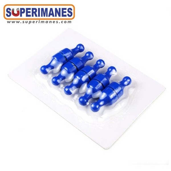 Imanes con forma de pequeño peón o ficha de jugador, con carcasa de plástico e imán de neodimio en su interior. Ideal para aguantar notas, fotos y otros documentos. Pack de 10 imanes de un mismo color, hay varios modelos de colores. Magnetización anisotrópica.