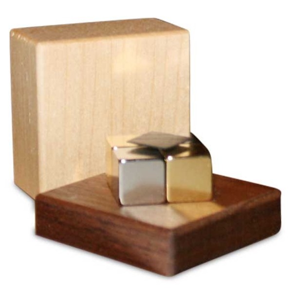 Los imanes y la plaquita de grafito van dentro de una caja de madera maciza en bicolor, tapa clara y base oscura. La caja de madera mide 47x47x37 mm. La tapa y la base llevan incorporados un imán para que estas se queden sujetas de manera magnética.