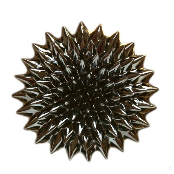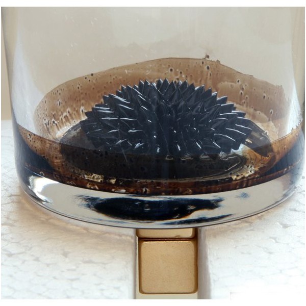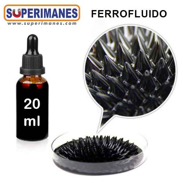 Ferrofluido: Líquido con diminutas partículas ferromagnéticas. Por lo general se trata de partículas de magnetita con un tamaño de aprox. sólo 10 nanómetros (0,00001 mm). Fuerte reacción a campos magnéticos y muestra un comportamiento algo extraño cuando se encuentra en un imán. Espectaculares visualización de púas o puntas en el ferrofluido que pueden realizar movimientos atraídas por el campo magnético.