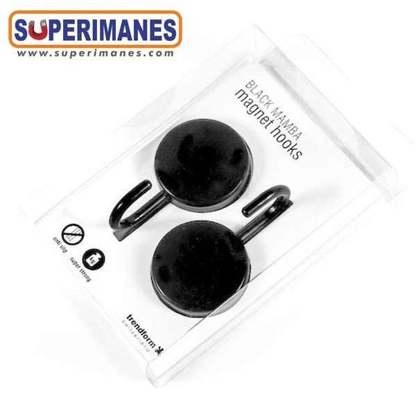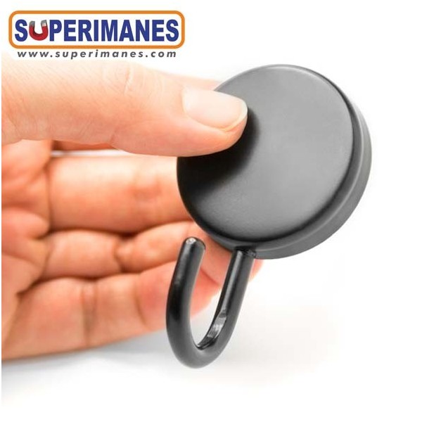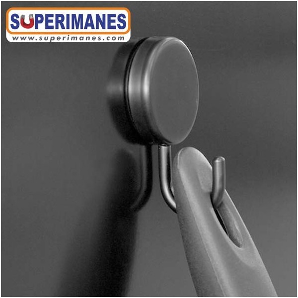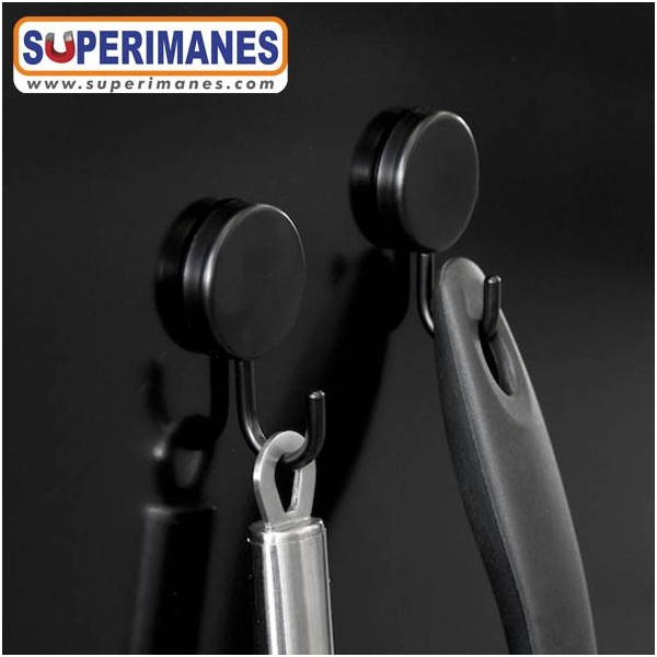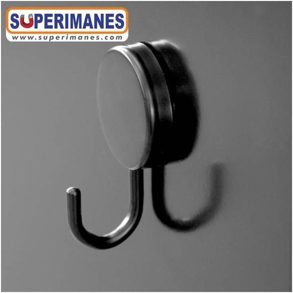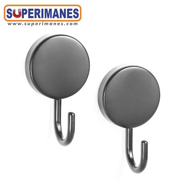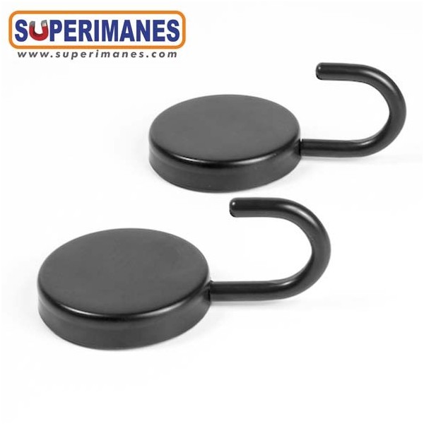 Estos imanes con ganchos son de color negros, se venden en paquetes de 2 unidades. Tienen un diámetro de 40 mm y un largo total con el gancho de 70 mm. Ideal para colgar objetos de hasta 2 kilos. Son de ferrita y tienen una capa de caucho que hace que sea antideslizante por la pared. Magnetización axial. El set tiene un peso de 200 gramos.