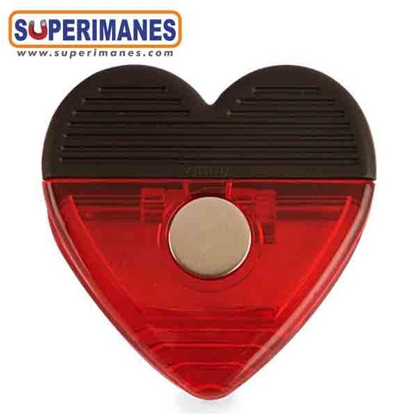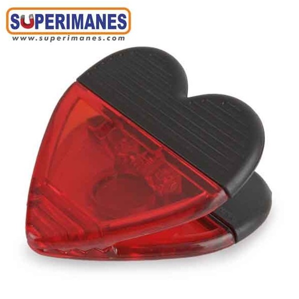 Pinzas corazón magnéticas. Con un imán de neodimio en la parte trasera. Tamaño 7x6,7x2 cms. Plástico y rojo y negro. Ideal para colocar notas, fotos y otros documentos en pizarras, frigoríficos, tableros o paredes metálicas. Imán con fuerza de 1,7 kilogramos, magnetización axial. Pueden llegar a sostener varias hojas A4.