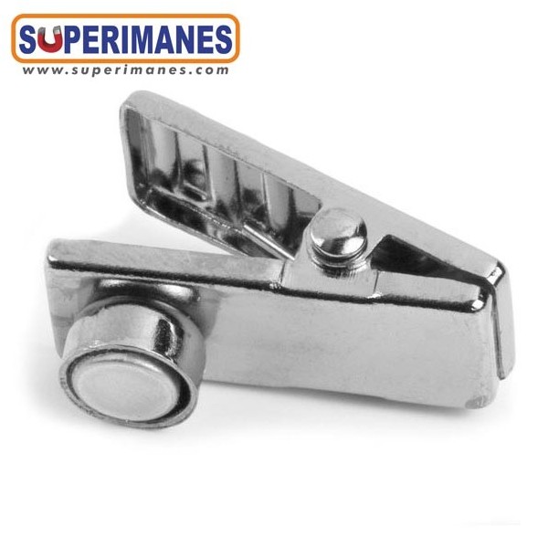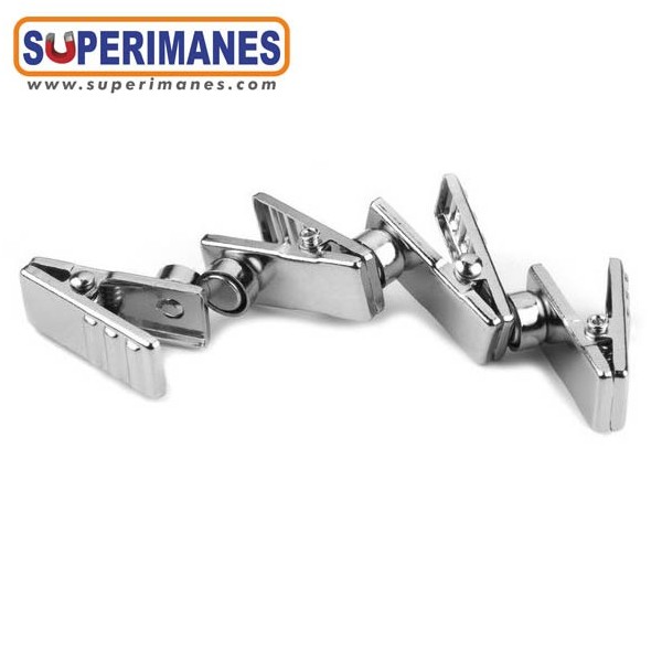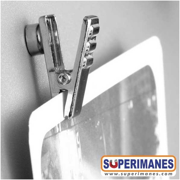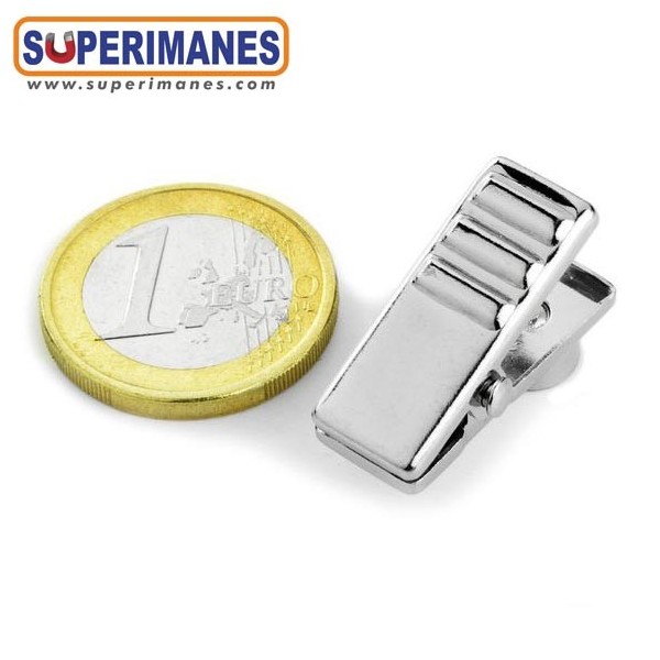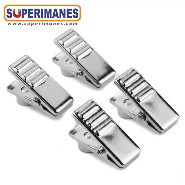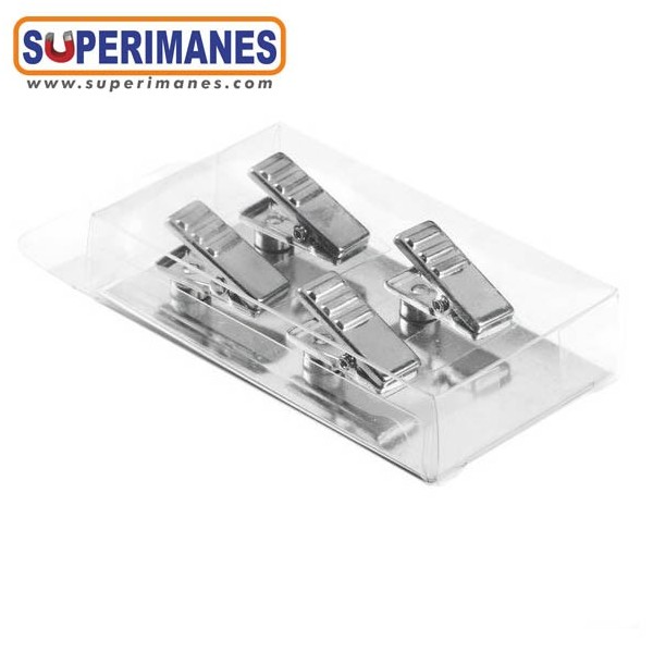 Pinzas metálicas magnéticas, con imán de neodimio en el dorso. Cromadas y pequeñas. Ideal para colocar notas, fotos y otros documentos en pizarras, frigoríficos, tableros o paredes metálicas. Imán con fuerza de 300 gramos, magnetización axial. Pueden llegar a sostener 9 hojas A4. Set de 4 pinzas/paquete.