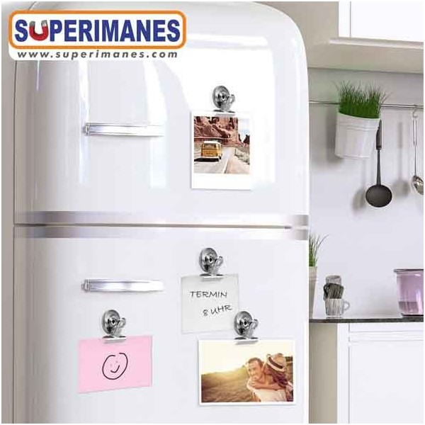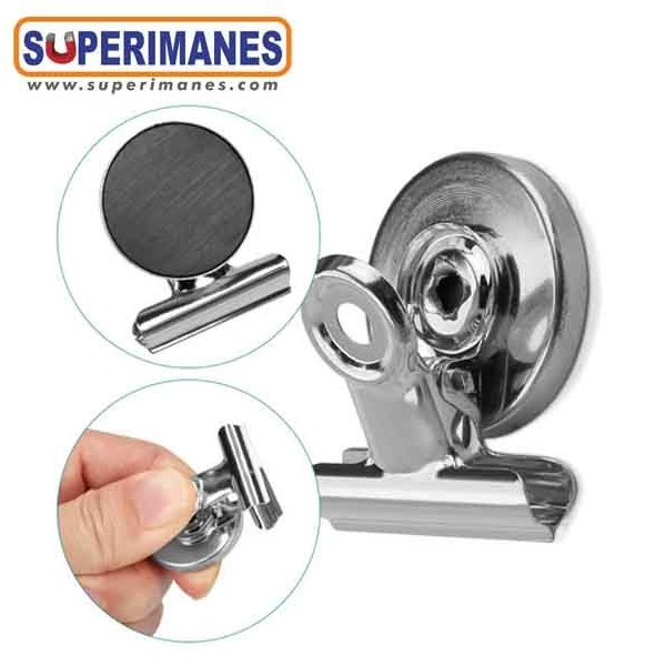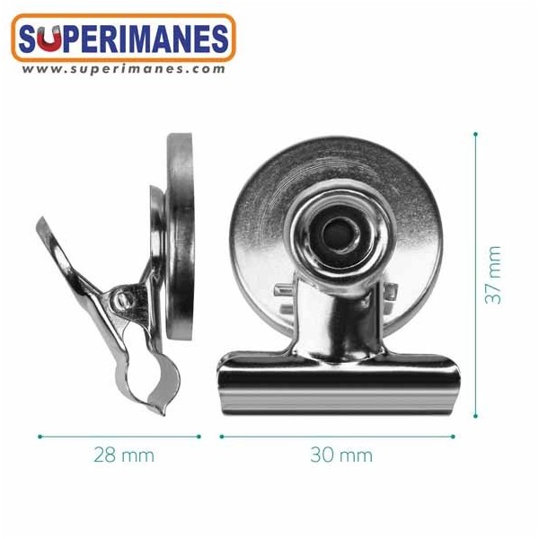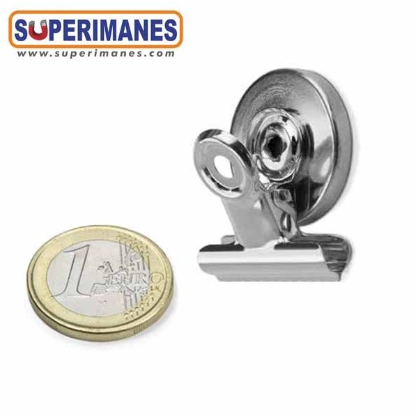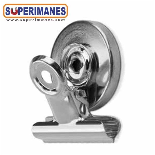 Pinzas metálicas magnéticas, con imán de ferrita en el dorso. Cromadas y pequeñas. Ideal para colocar notas, fotos y otros documentos en pizarras, frigoríficos, tableros o paredes metálicas. Imán con fuerza de 400 gramos aproximadamente, magnetización axial. La pinza tiene un tamaño de 30 mm de largo ideal para coger un papel u objeto y que no se resbale de la pinza. Esta pinza lleva un imán de ferrita de diámetro 25 mm.