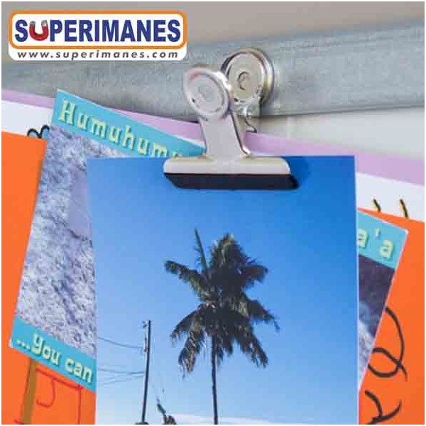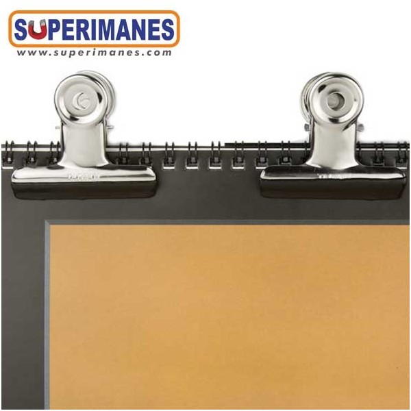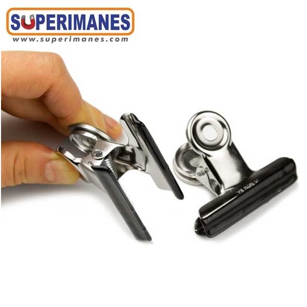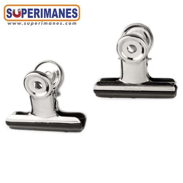 Pinzas metálicas magnéticas, con imán de neodimio en el dorso. Cromadas y pequeñas. Ideal para colocar notas, fotos y otros documentos en pizarras, frigoríficos, tableros o paredes metálicas. Imán con fuerza de 3 kilogramos aproximadamente, magnetización axial. La pinza tiene un revestimiento de plástico negro para agarrar bien el objeto y que no se resbale de la pinza. Pueden llegar a sostener 50 hojas A4. Set de 4 pinzas/paquete.