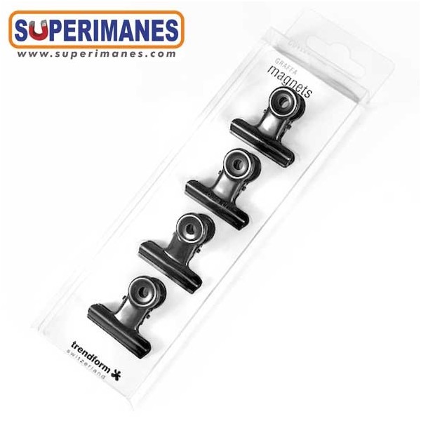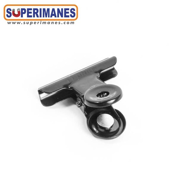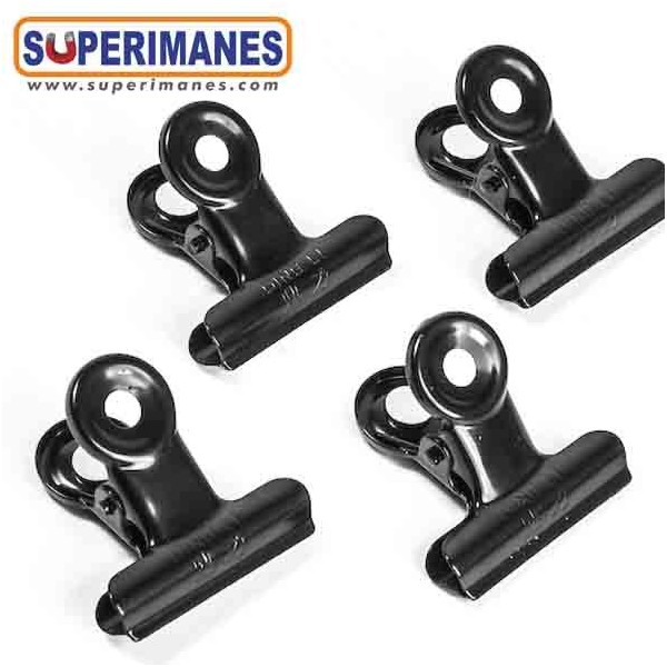 Estos pinzas con imán son metálicas negras, se venden en paquetes de 4 unidades. Tienen un largo de 30 mm y una altura de 30 mm. Ideal para colocar fotos, notas, papeles, folletos, ofertas. Muy discretas. Llevan un imán de neodimio de medida 10x1mm. Magnetización axial. Sostienen 5 hojas papel A4. Fuerza 540 gramos aproximadamente unidad. El set tiene un peso de 42 gramos.