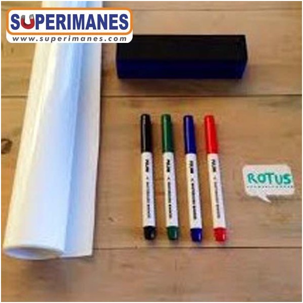 Esta lámina magnética flexible tiene tamaño 120x60 cm y lleva una cara blanca con tratamiento de pizarra blanca donde podrá escribir y dibujar con rotuladores para pizarra y después borrarlo. La otra cara del producto es imán de color gris oscuro tirando a negro.