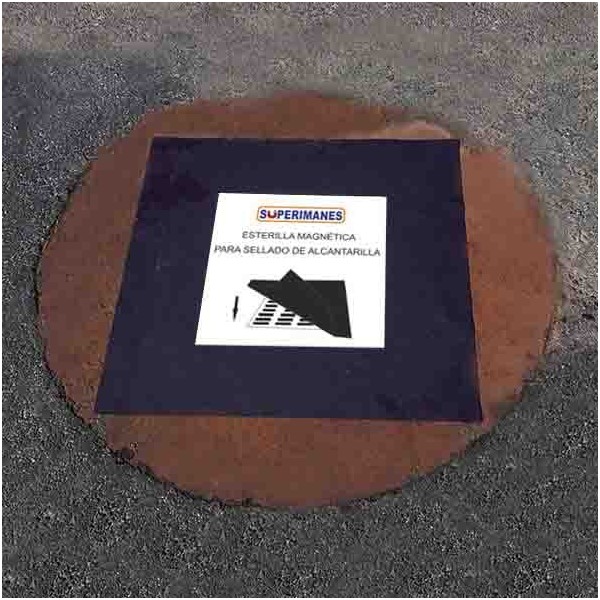 Este producto es un imán en goma o caucho de grosor 1 mm que puede usarse para sellar la alcantarilla o sumidero de forma magnética. Esta alfombra o estera flexible hace la función de tapa quedando pegada al metal de la alcantarilla cerrando la entrada y salida a la misma.