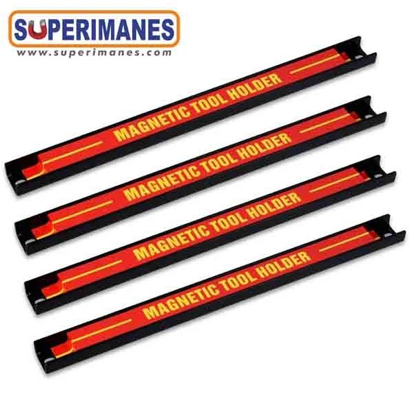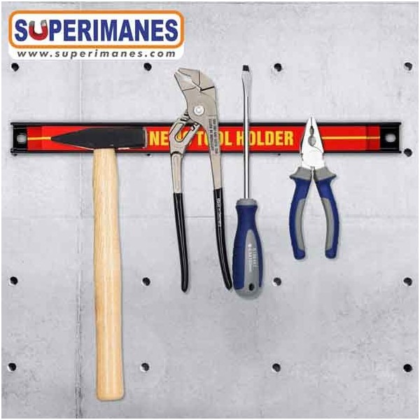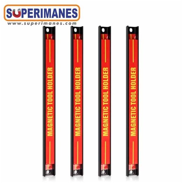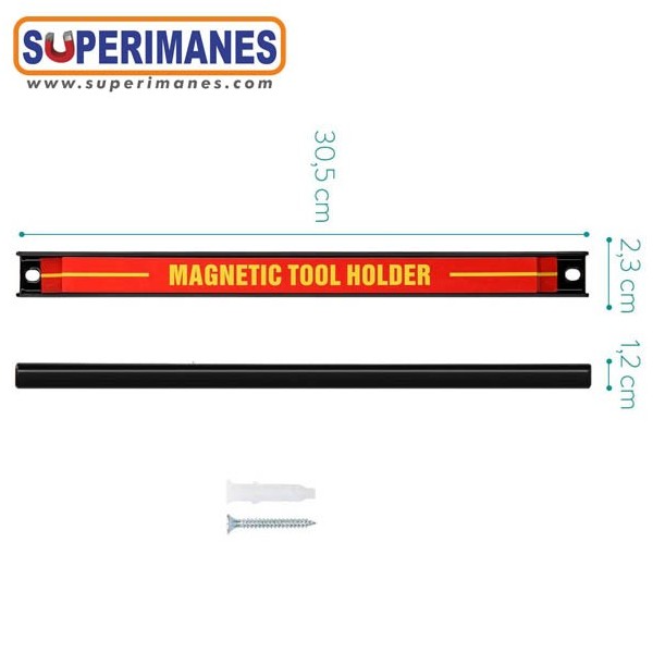 Soporte portaherramientas magnético de longitud 30,5cm para atornillar a pared. Ideal para colocar en el todo tipo de herramientas en talleres, garajes e incluso cocinas para sujetar cuchillos. Medidas 30,5 x 2,3 x 1,2 cm. Fuerza sujeción aproximada de 15 kg. Para atornillar con dos tornillos. Material metalico color negro con imanes de ferrita en su interior y adhesivo color rojo. La pieza tiene un peso de 480 gramos.